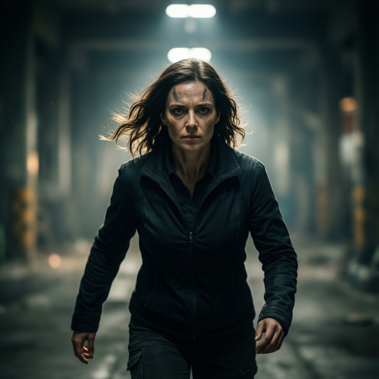 • Отчуждение в пространстве. Холодный верхний свет делает героя "маленьким" в локации. Решение: верхний жёсткий источник и глубокие тени под глазами/подбородком.